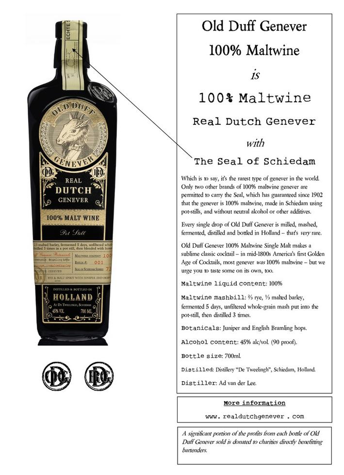 We make two genevers; Old Duff Genever and Old Duff Genever 100% Maltwine with the Seal of Schiedam. (The first label for this also said "Single Malt", but now they all say "100% Maltwine").